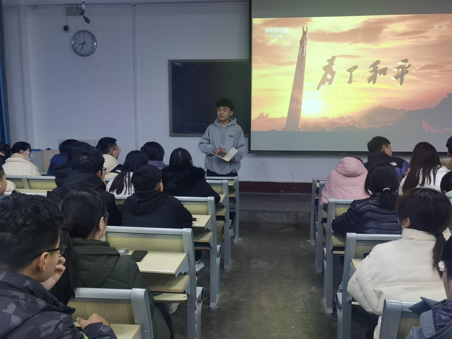 活动伊始,团委委员王其鲁先指出了本次活动的意义并就《为了和平》的剧情做了简单介绍,要求大家认真观看影片,学习其中的精神价值该片共6集,采取史论结合、故事表达的方式,回顾呈现中国共产党领导抗美援朝战争的光辉历程和宝贵经验,全面反映抗美援朝战争的正义性质和伟大胜利,深入反映伟大的抗美援朝精神的丰富内涵和时代价值,集中展示中国人民志愿军的英雄事迹和革命精神,生动展现全国各族人民同仇敌忾、众志成城的大力支援和家国情怀,充分彰显中华民族不畏强暴、维护和平的坚定决心和巨大贡献。影片播放完毕,同学们百感交集、心潮澎湃,感受到了作为新时代青年的使命与担当,坚定了砥砺奋斗的远大理想。对历史最好的纪念,就是创造新的历史。”同学们表示今后一定会牢记初心使命,坚定必胜信念,发扬斗争精神,增强斗争本领,为实现中华民族伟大复兴的中国梦作出更大贡献。