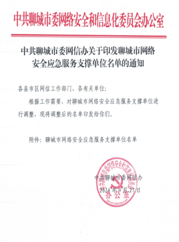 聊城市委网信办为深入贯彻落实《中华人民共和国网络安全法》,进一步提升聊城市网络安全保障能力,强化网络安全事件应急处置能力,面向社会公开遴选的网络安全应急服务支撑单位。