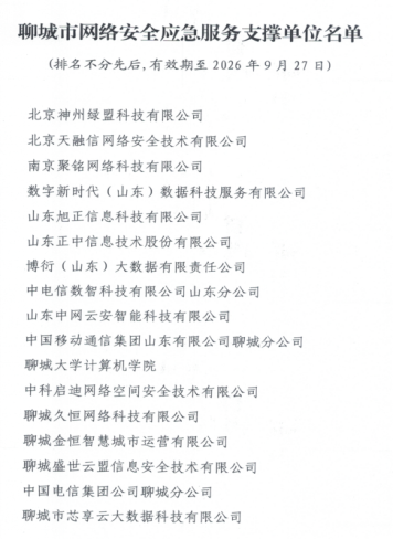 历经相关单位自主申报、材料审核、审批等环节严格筛选, 近日,聊城市委网信办发布了《聊城市网络安全应急服务支撑单位名单》,最终共有17家具备强大技术实力和社会责任感的网络安全机构脱颖而出,乐竞(中国)位列其中。