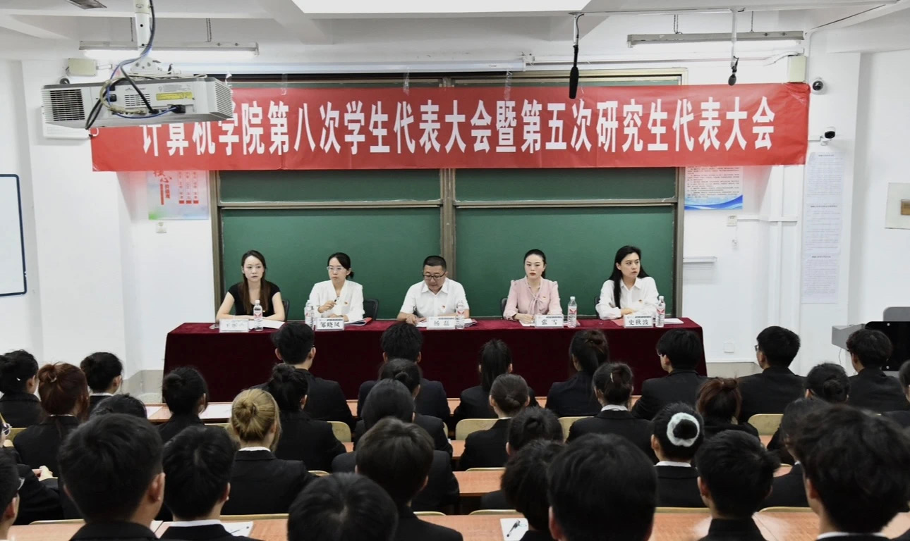 在庄严的国歌声中,大会拉开序幕。学生代表张晓宇宣读来自兄弟学院的贺信,热烈祝贺计算机学院此次大会的顺利召开。张雪为大会致辞,高度肯定了学院学生会、研究生会在过去一年取得的成绩,希望学生会组织守好青年思想的“责任田”、建好青年发展的“新阵地”、搭好青年成长的“服务梯”,强化思想引领、聚焦服务职能、繁荣校园文化、完善管理机制,以实际行动不负学院和全体同学的信任,为计算机学院的持续发展和个人价值的实现而不断努力。杨磊代表学院党委对大会的召开表示热烈祝贺,对大会代表和全院青年学生致以亲切的问候,他表示,希望学生会组织深刻领会习近平总书记重要指示的深刻内涵与精神实质,继续坚守初心、勇于担当,脚踏实地、从严管理,强化理论学习、深化实践锻炼,搭建服务平台、创新组织模式,团结带领广大青年学子坚定不移听党话、跟党走,争当“走在前、挑大梁”的生力军,踔厉奋发、勇毅前行,为奋力谱写中国式现代化新篇章汇聚磅礴青春力量。