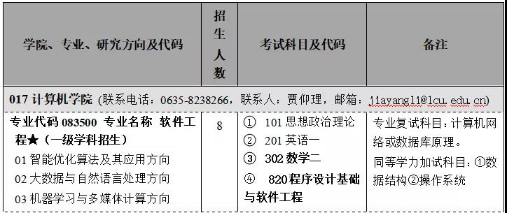 我院研究生招生计划全为全日制学术学位,软件工程初试科目英语、政治、数学(数学二)为国家统考,专业课综合为我校自主命题。初试和复试参考书目请与学院联系(0635-8238789);往年试题可在聊城大学研究生主页下载(http://yjsc.lcu.edu.cn)。